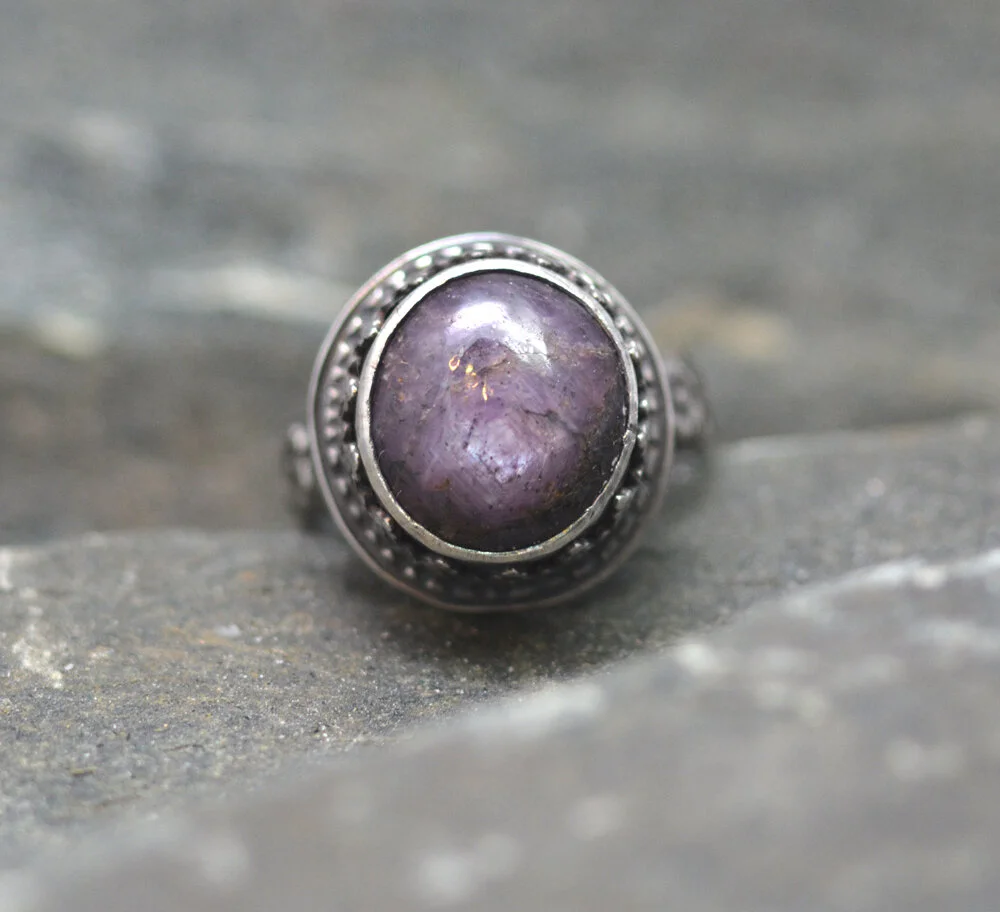 Lovely cocktail ring featuring a raw, untreated ruby with a LOT of sheen. the color is almost a purply-red and it really glows.